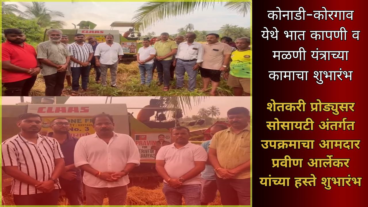 शेतकरी प्रोड्युसर सोसायटी अंतर्गत उपक्रमाचा आमदार प्रवीण आर्लेकर यांच्या हस्ते शुभारंभ शेतकरी प्रोड्युसर सोसायटी अंतर्गत कोनाडी-कोरगाव येथे भात कापणी व मळणी यंत्राच्या कामाचा शुभारंभ आमदार प्रवीण आर्लेकर यांच्या हस्ते करण्यात आला. या कार्यक्रमाला चेअरमन उदय प्रभुदेसाई, स्थानिक पंच देविदास नागवेकर आणि राहुल भगत उपस्थित होते. या यंत्रामुळे शेतकऱ्यांना शेतीतील कामात मोठी सुविधा मिळणार असून उत्पादनक्षमतेत वाढ होण्याची अपेक्षा व्यक्त करण्यात आली.