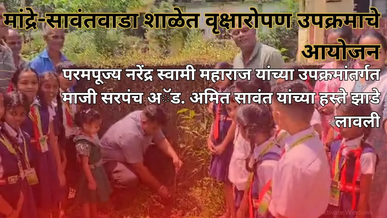 परमपूज्य नरेंद्र स्वामी महाराज यांच्या उपक्रमांतर्गत माजी सरपंच अॅड. अमित सावंत यांच्या हस्ते झाडे लावली परमपूज्य नरेंद्र स्वामी महाराज यांच्या उपक्रमांतर्गत मांद्रे-सावंतवाडा सरकारी प्राथमिक शाळेच्या परिसरात वृक्षारोपण कार्यक्रम आयोजित करण्यात आला. या कार्यक्रमात माजी सरपंच अॅडव्होकेट अमित सावंत यांच्या हस्ते झाडे लावण्यात आली. पर्यावरण संवर्धनाचा संदेश देत या उपक्रमात शाळेचे शिक्षक, विद्यार्थी व ग्रामस्थांनीही उत्साहाने सहभाग नोंदविला.