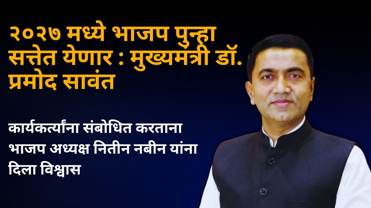 कार्यकर्त्यांना संबोधित करताना भाजप अध्यक्ष नितीन नबीन यांना दिला विश्वास भाजपच्या कार्यकर्त्यांना संबोधित करताना मुख्यमंत्री डॉ. प्रमोद सावंत यांनी २०२७ च्या विधानसभा निवडणुकीत भाजप पुन्हा सत्तेत येईल, असा ठाम विश्वास व्यक्त केला. पक्षाचे राष्ट्रीय अध्यक्ष नितीन नबीन यांच्या उपस्थितीत बोलताना, प्रत्येक कार्यकर्ता पूर्ण ताकदीने काम करून भाजपला पुन्हा सत्तेत आणण्यासाठी प्रयत्न करेल, असे आश्वासन त्यांनी दिले. संघटनात्मक मजबुती, विकासाभिमुख धोरणे आणि कार्यकर्त्यांची निष्ठा याच बळावर भाजप २०२७ मध्ये यश मिळवेल, असे मुख्यमंत्री सावंत यांनी यावेळी नमूद केले.