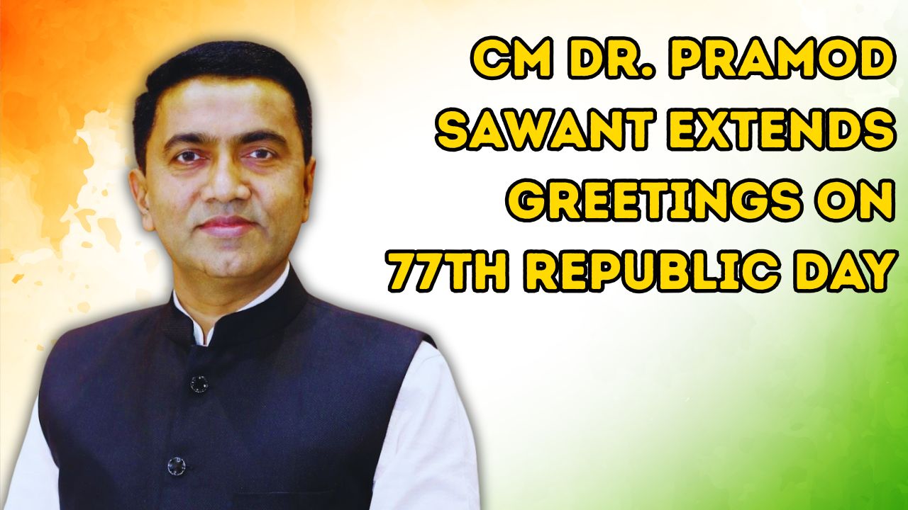 Chief Minister wishes citizens a day of patriotism and pride Chief Minister Dr. Pramod Sawant extended his greetings to the people of Goa on the occasion of the 77th Republic Day. In his message, he urged citizens to celebrate the day with patriotism and unity, while reaffirming the values and ideals enshrined in the Constitution of India.