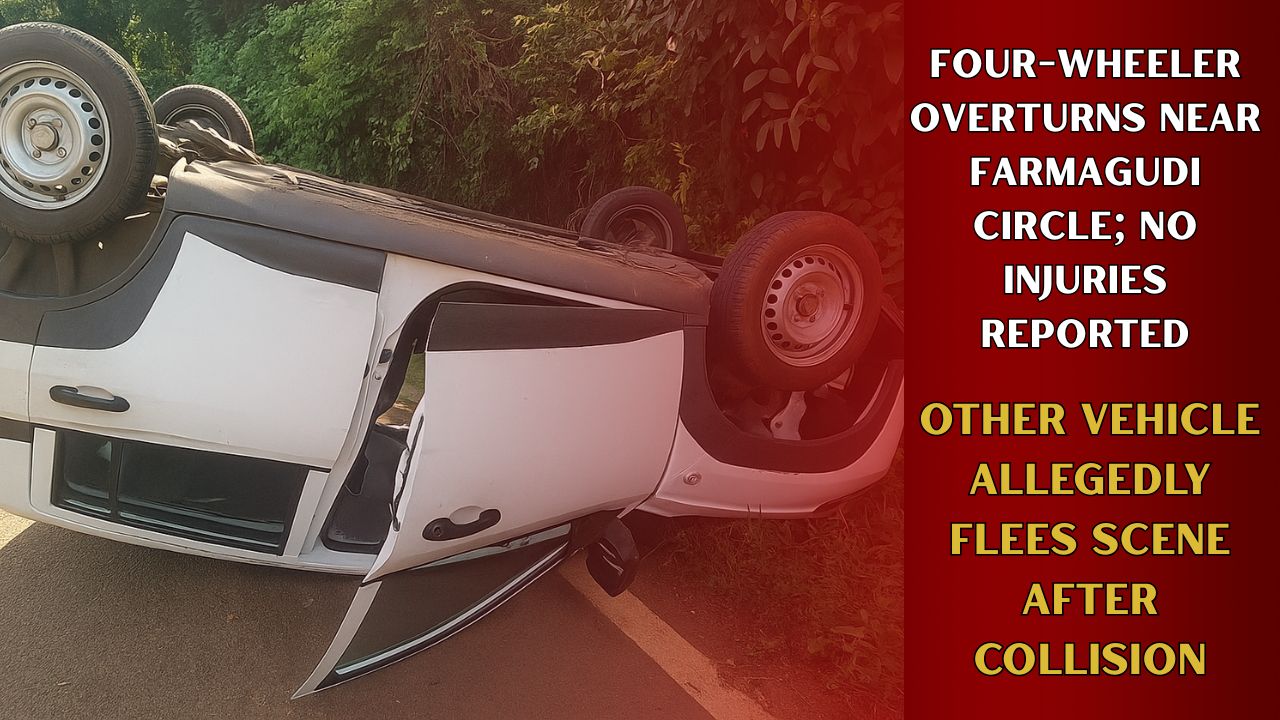 Other Vehicle Allegedly Flees Scene After Collision A four-wheeler overturned near Farmagudi Circle on Tuesday, but fortunately, no injuries were reported. The driver stated that another vehicle collided with his car, causing it to overturn, after which the other vehicle reportedly fled the scene. Police have registered a case and are investigating.