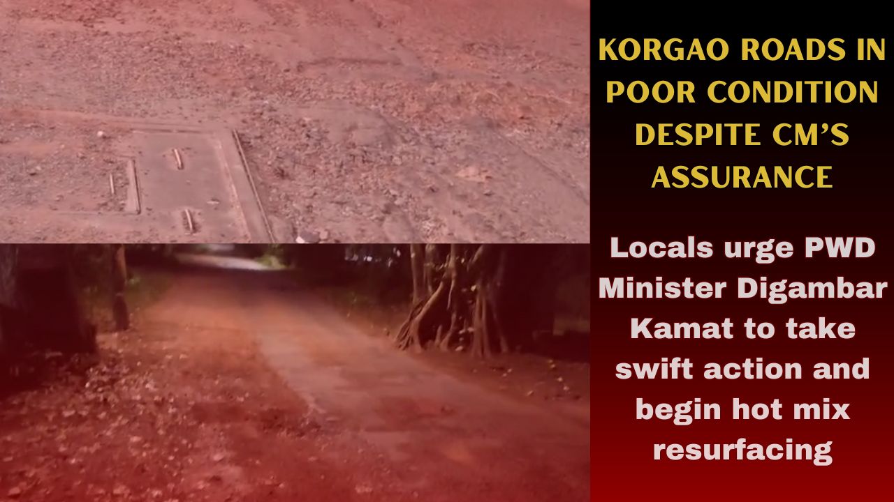 Locals urge PWD Minister Digambar Kamat to take swift action and begin hot mix resurfacing Residents of Korgao have raised strong concerns over the deteriorating condition of village roads, urging PWD Minister Digambar Kamat to intervene and initiate immediate hot mix resurfacing work. Citizens have also questioned Chief Minister Dr. Pramod Sawant’s earlier assurance that all roads in the state would be asphalted by November 15, expressing frustration over the continued neglect of local infrastructure.