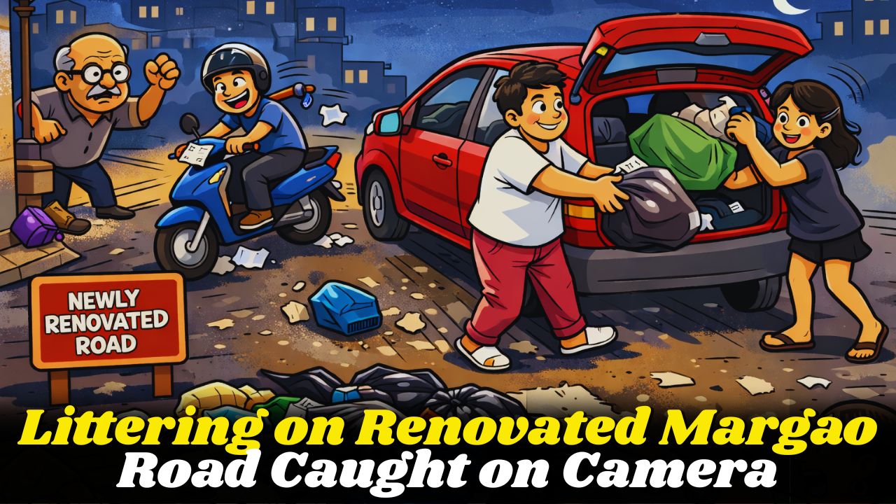 Young commuters seen dumping garbage from cars and scooters Several young, well-dressed commuters were caught on camera casually throwing garbage from their cars and scooters onto a freshly renovated road in Margao before driving away. The incident has triggered public anger and renewed debate on civic responsibility and the need for stricter enforcement against littering.