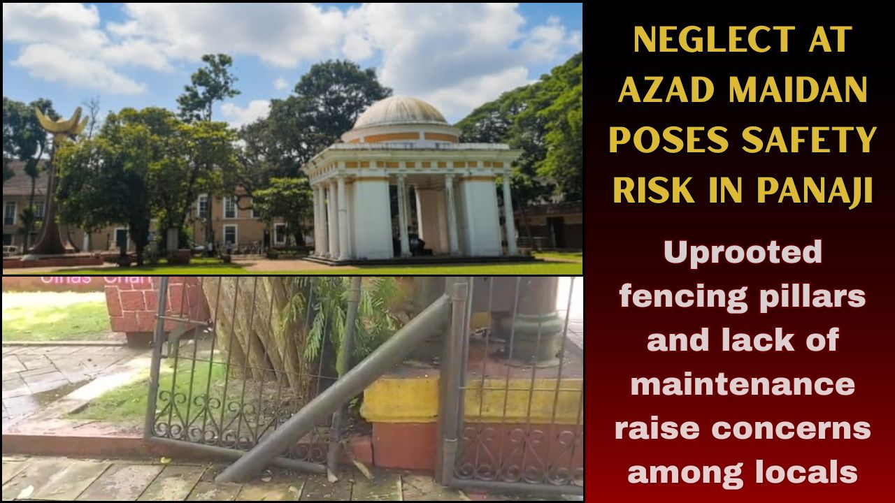 Uprooted fencing pillars and lack of maintenance raise concerns among locals Azad Maidan, located in the heart of Panaji, is facing severe neglect, with uprooted fencing pillars and no safety measures in place. Locals have expressed concern over the potential hazards, urging authorities to take immediate action to maintain the area and ensure public safety.