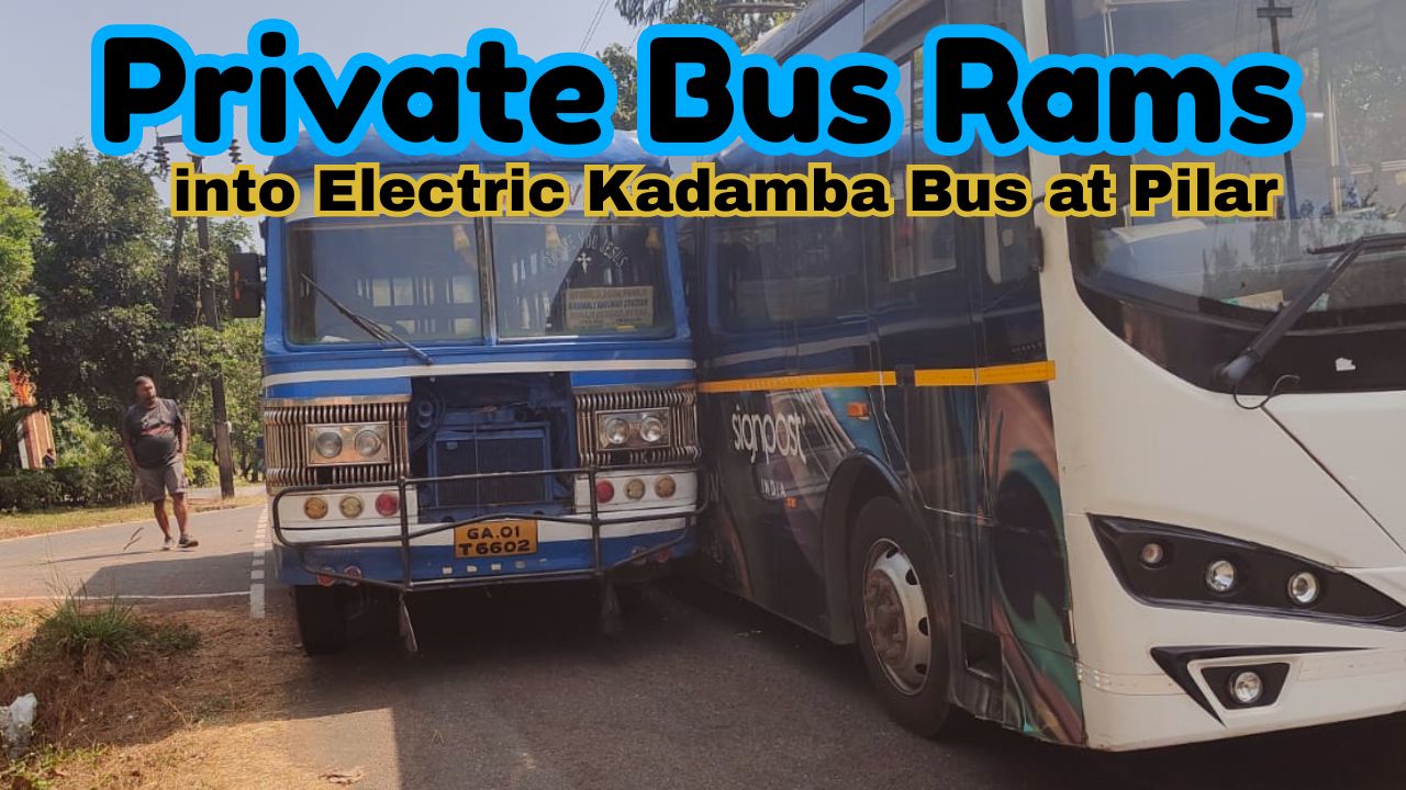 Major Collision Causes Heavy Damage; No Injuries Reported A private bus collided with an electric Kadamba bus at Pilar early today, resulting in a major crash. Though no injuries were reported, the electric Kadamba bus suffered significant damage in the impact. Police and locals quickly reached the spot, and further details regarding the cause of the accident are awaited.