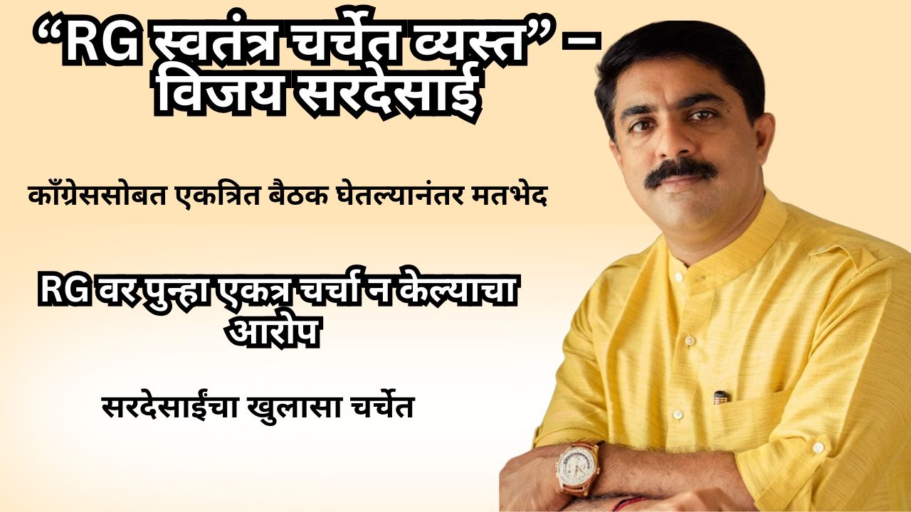 काँग्रेससोबत एकत्रित बैठक घेतल्यावर RG ने पुन्हा एकत्र चर्चा न केल्याचा आरोप विजय सरदेसाई यांनी सांगितले की, RG सोबत काँग्रेसची एकत्रित बैठक घेण्यात आली होती, मात्र त्यानंतर कोणतीही चर्चा एकत्र घेतली गेली नाही. RG ने स्वतंत्रपणे चर्चासत्रे सुरू ठेवली असा खुलासा विजय सरदेसाई यांनी केला