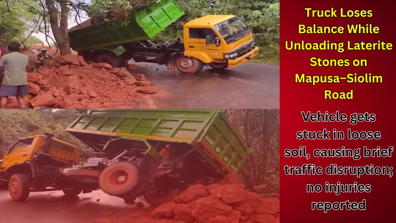 Vehicle gets stuck in loose soil, causing brief traffic disruption; no injuries reported A minor mishap occurred on the Mapusa–Siolim road earlier today when a truck carrying laterite stones lost balance while unloading and got stuck in loose soil by the roadside. The incident briefly disrupted traffic movement in the area. Fortunately, no injuries were reported, and efforts are underway to tow the vehicle and restore normal flow.